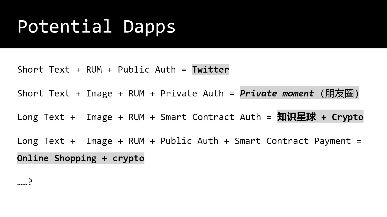 刚才说了也接受了一些教训,做一个分布式只做协议这是不够的,必须要有一个真正的能代表你的应用,这时候人们才会被它吸引,用户也知道它是什么,所以我们就换了一种方法去做,而且这种方法会比过去那个清晰很多。