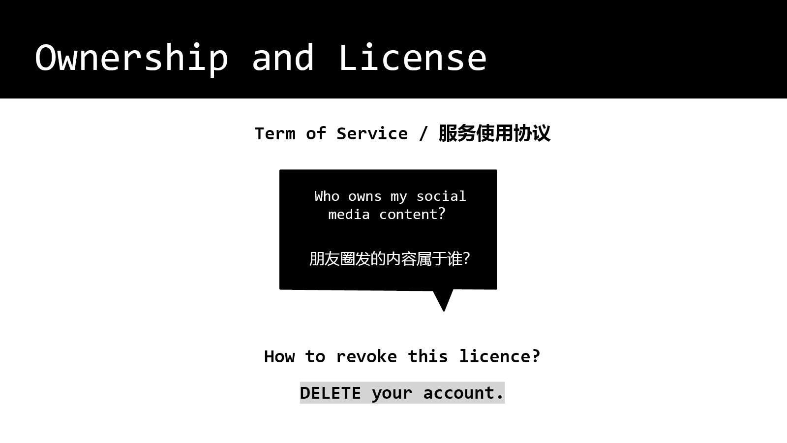 所以这个问题呢,—— 我刚才说了,全世界人都在问。 英文用户问的通常是说,谁拥有我在社交媒体上发的内容? 那中文呢可能更针对一点,大家就会问,朋友圈发的内容属于谁? 如果你查看这几年的新闻,中文、英文都有这样的问题。 大家都在探讨,在法律上这个东西属于谁。