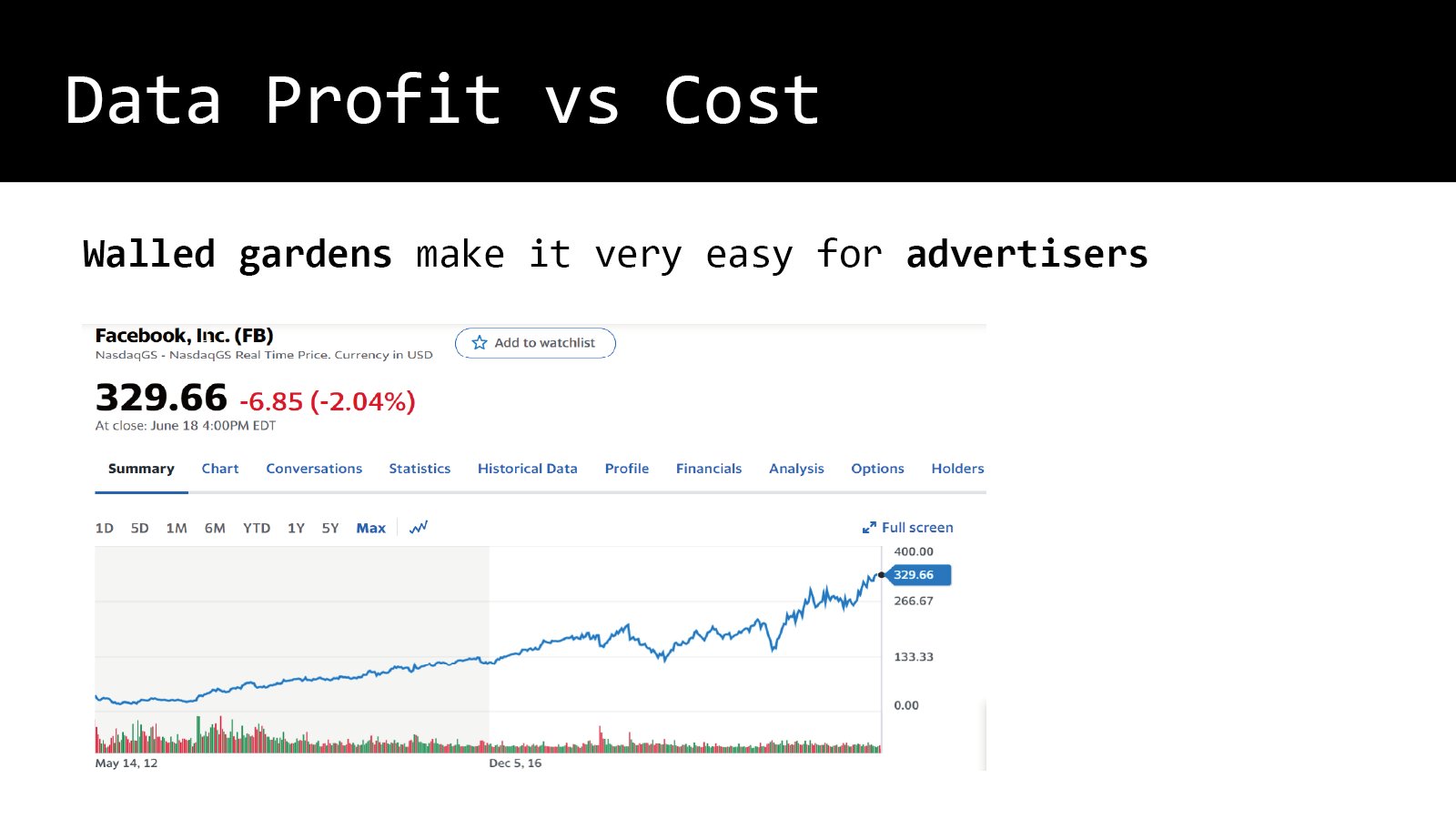 这个利润有多大呢? 我们可以看到 Facebook 这些年股价的增长。 从 2012 年开始,这个股价实际上已经翻了几十倍了吧,甚至可能 —— 最早的用户应该有十几块钱买的,就几十倍、上百倍。